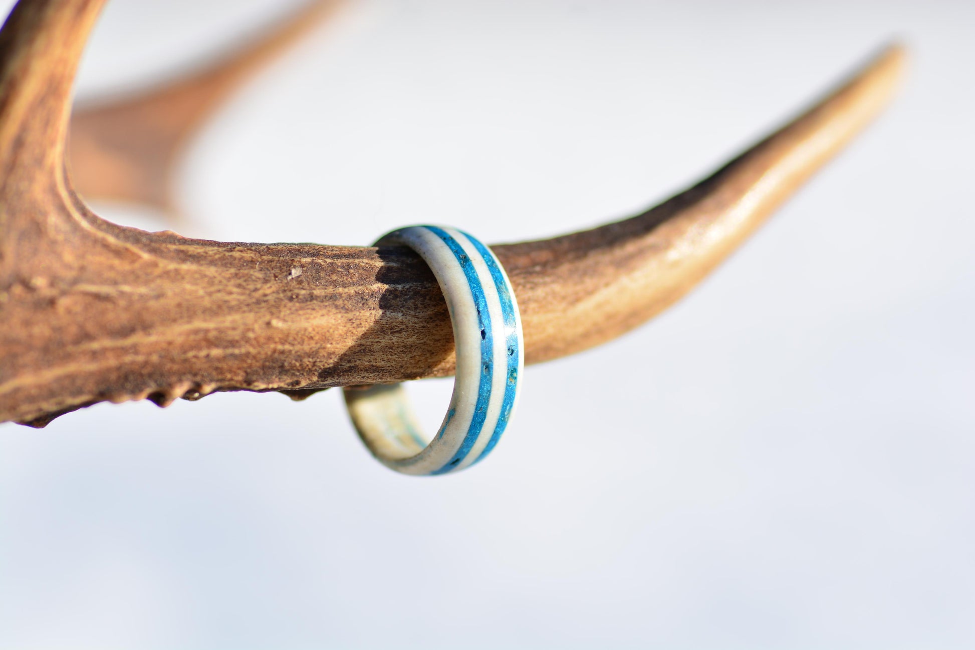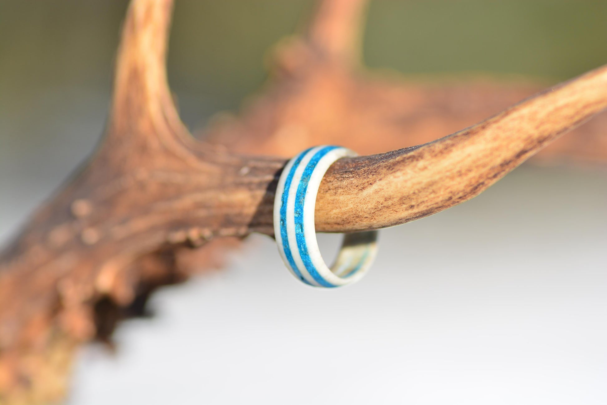 This handmade ring is crafted from real deer antler and finished with three slim turquoise inlay stripes, creating a soft, elegant contrast between natural ivory tones and vibrant blue. The design feels light, feminine, and inspired by nature.