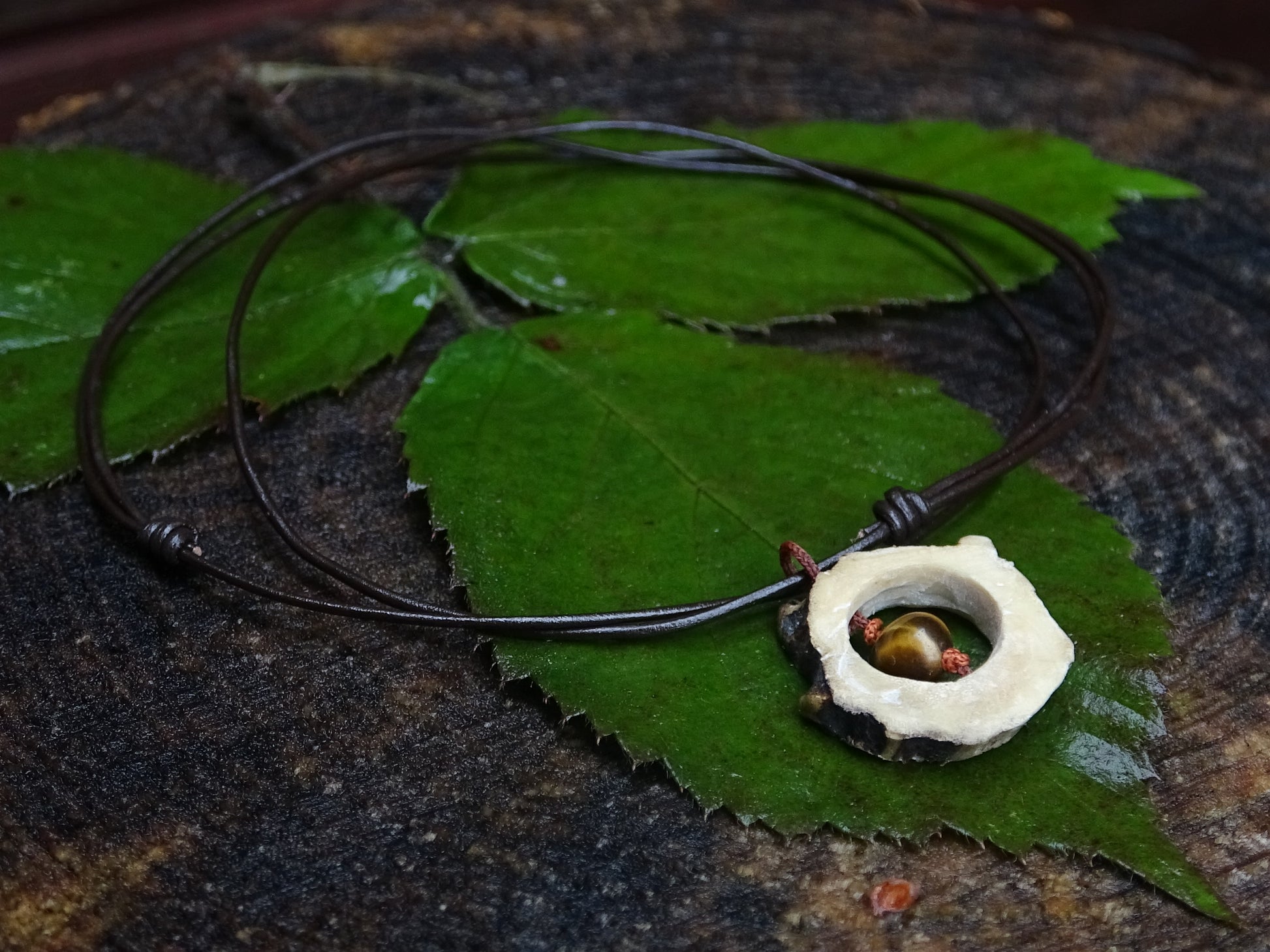 The Forest Charm Necklace is made from a real roe deer antler slice, naturally shed and respectfully gathered from European woodlands. Suspended in the center is a polished Tiger Eye gemstone, held in place by two small knots — a subtle symbol of protection, grounding, and intentional craft.