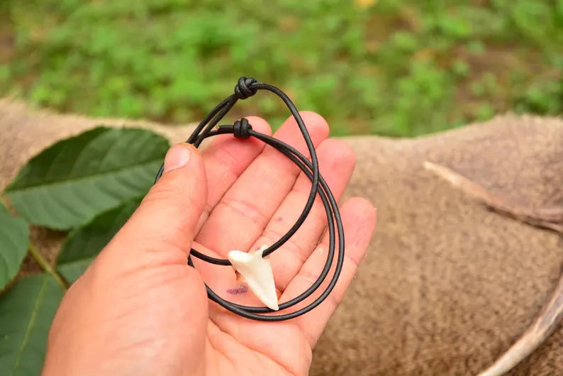This primitive-style necklace features a real roe deer hoof bone, hand-cleaned and naturally preserved. Its pointed, jagged shape resembles a shark tooth — a rugged piece of forest-born bone crafted into a striking pendant.
